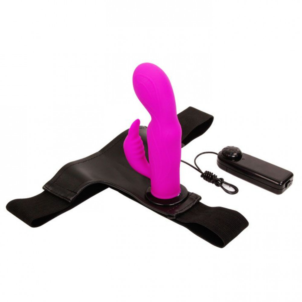 АКЦИЯ 35% Страпон с мультискоростной вибрацией с клиторальным стимулятором, силикон, фуксия, 16(12)х3,5 см