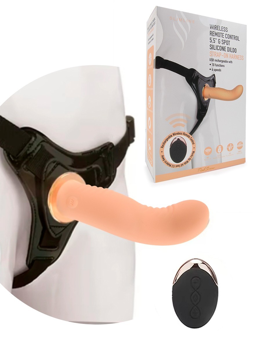 Перезаряжаемый страпон с вибрацией, пульт ДУ, 10 режимов, силикон, телесный,14х3,6 см