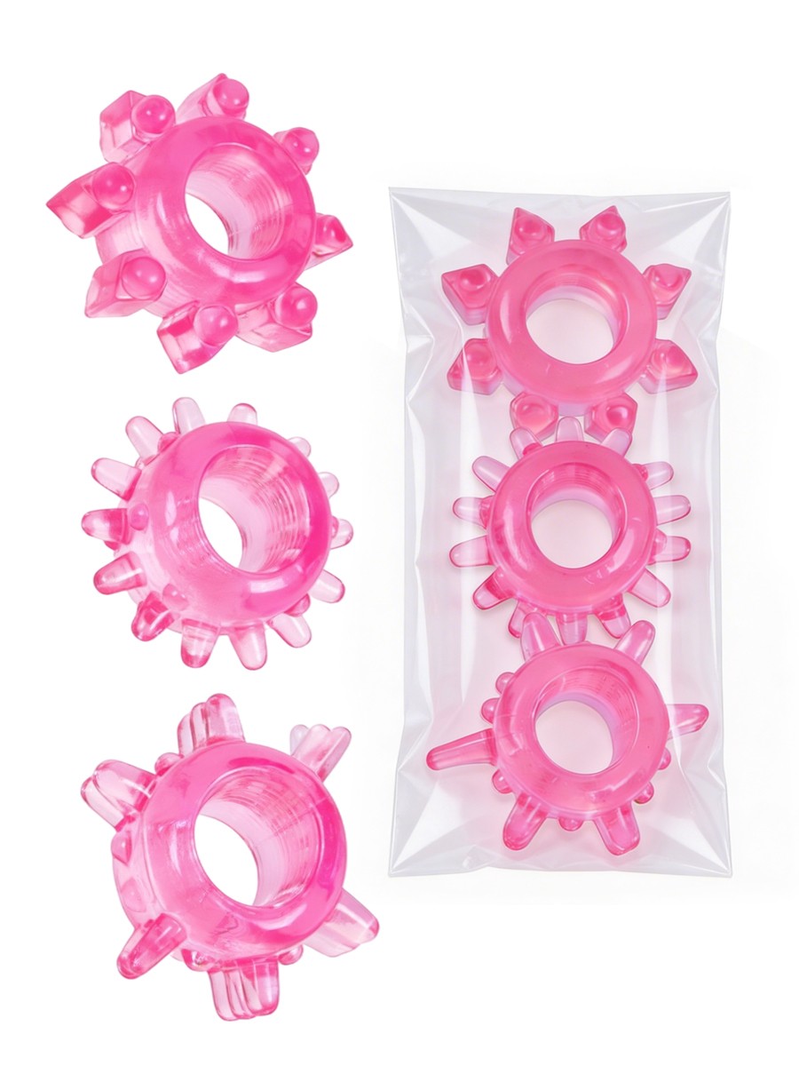 Эрекционные кольца обеспечат продолжительную эрекцию и поможет продлить интимную близость. Шипики разнообразного рельефа и размера на внешней поверхности колец будут приятно стимулировать интимные зоны партнёрши.